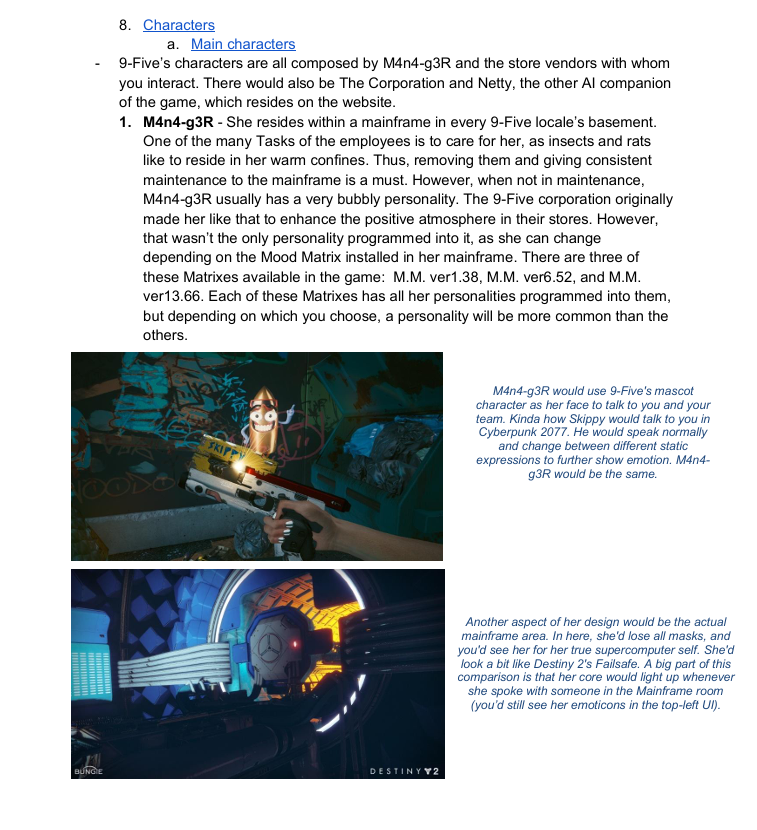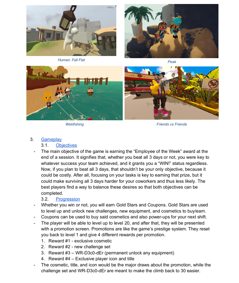 9-Five is a game meant to make the dreaded 9-5 of our day and age into an actual fun experience where you can both help and compete with your fellow coworkers. The game will require players to cooperate to ensure the convenience store, aptly named “9-Five”, runs smoothly by attending to the needs of all customers. These customers will have desires that need to be fulfilled, such as food to eat, tobacco to smoke, home supplies to purchase, or to use the bathroom, among other things. To make sure your customers leave happy, the store must be kept running, and that is where the Task List comes in. 9-Five has an AI companion, M4n4-g3R, that constantly monitors the facilities' status and continuously adds new Tasks to be completed within them. Complete Tasks to increase M4n4-g3R’s Approval Rating (AR, for short). An appropriate Approval Rating will ensure your team makes it through the day. Survive 3 days to finish a full 9-Five game. However, there is a bit of spice to this recipe: the “Employee of the Week” award and the Punishment system. By the end of the 3 days, there will be an “Employee of the Week” award. While you and your team definitely want to make it to the end of the week unscathed, you all also want this coveted prize. The “Employee of the Week” is the absolute true winner of a game of 9-Five, determined by who earns the most AR points over the 3 days. By earning this achievement, you will earn the most XP (Gold Stars) and Money (Coupons) rewards in the match, and you could also earn cosmetics. To gain AR points, it’s simple: do Tasks, attend to any customer needs, and help your peers in whatever Task they are on. Do know, though, that any help you provide won’t be as rewarding as for the one who started it. This is where the game's competitive edge emerges. The whole game, you need to move fast and steady to both reach each Task in time and show M4n4-g3R your initiative while doing it correctly. What balances all of this further is the Punishment System. Any time M4n4-g3R sees you fail a Task, she will punish you. Obviously, a hit to your Approval Rating will ensue. However, there are…other, more physical punishments. Including stuff like a memo lecture (stuck on the M4n4-g3R’s mainframe room as she lectures to you about your mistakes, but can be liberated early by any employee by sacrificing the Major Approval result), sanctioned beatings (a Punishment Task that requires you and your team to beat the shit out of a punished player), forced work companionship (leashed to another player for some time and help them with Tasks), and more!. Through all of these mechanics and challenges, 9-Five puts its players in a sandbox where cooperation is the key to survival, but competition is the key to victory.